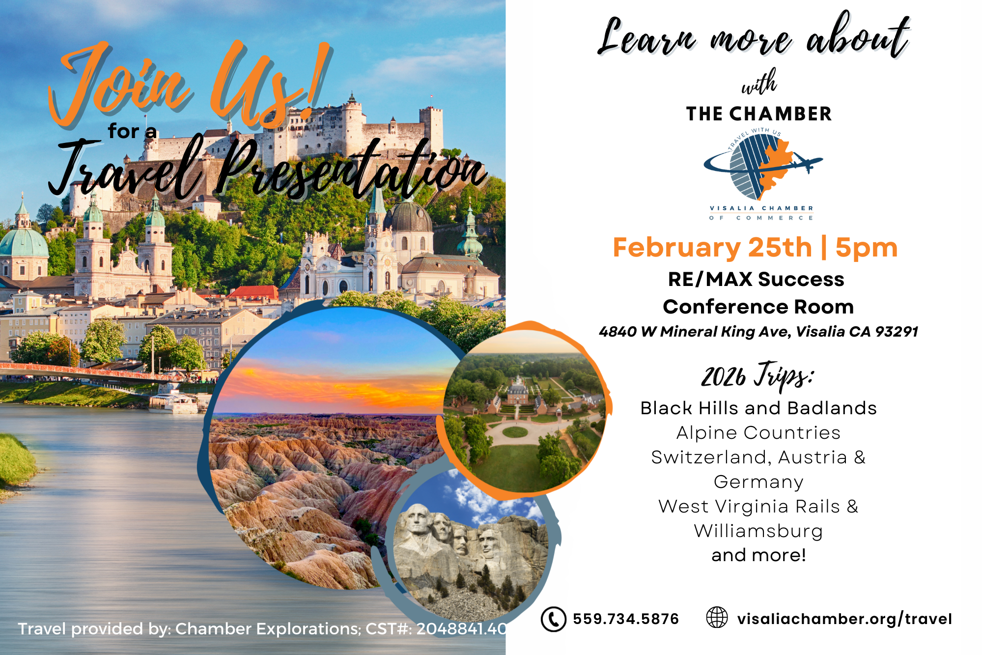 Attend a slide show presentation to learn more about the trip you're interested in such as what's included and what you'll need to do to sign up. Can't make the slide show? Call the Chamber at (559) 734-5876 or email info@visaliachamber.org to get all of the information you missed.